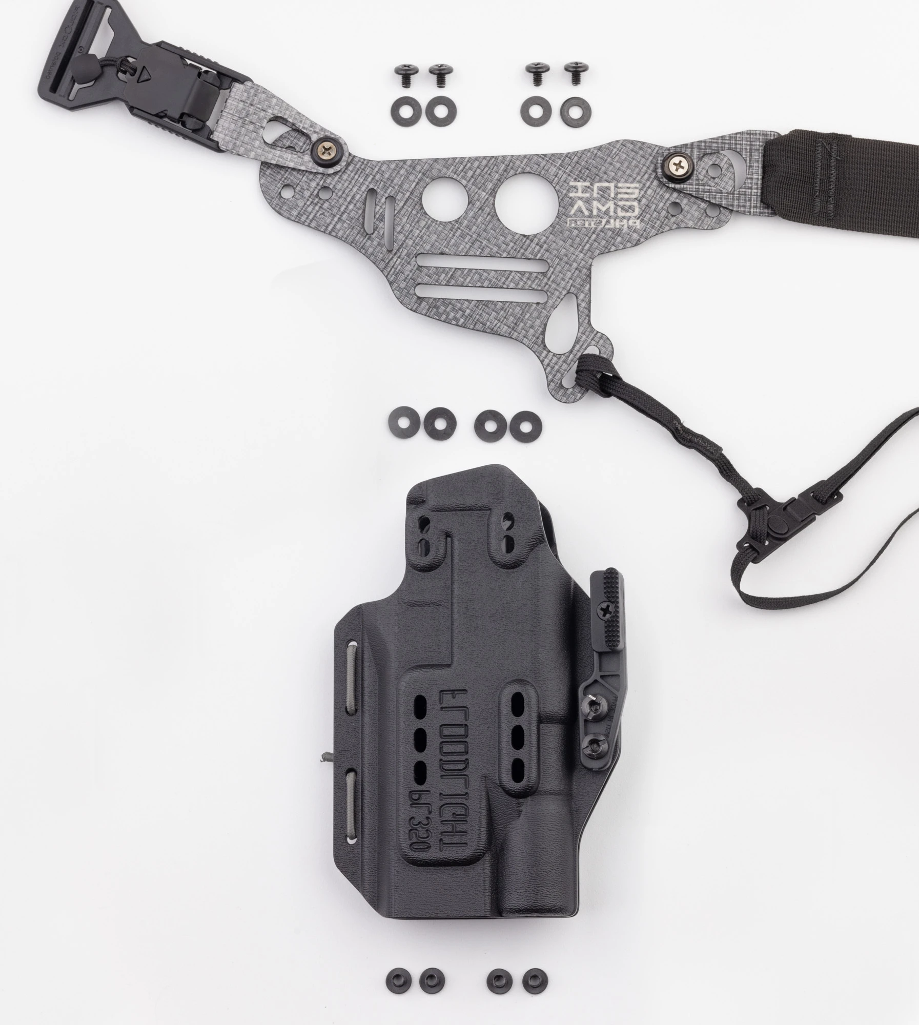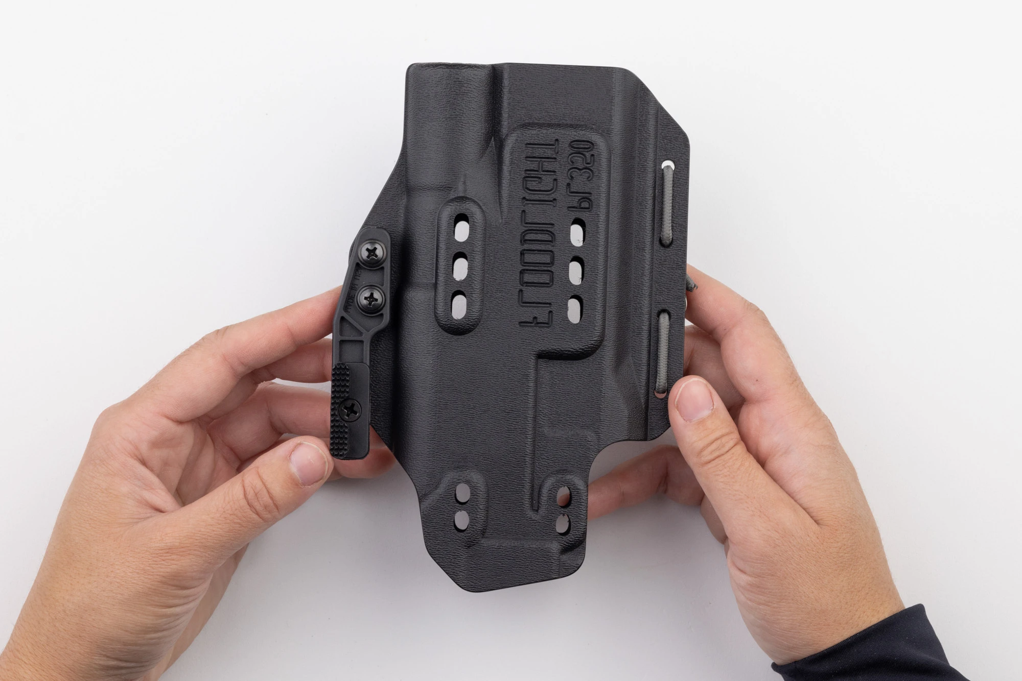 HOLSTER COMPATIBILITY: Please note that you must have a compatible holster shell for the Light Bearing Enigma before beginning. Check your holster against the holster fit guide before you begin. If your shell does not fit, STOP and review the fit guide before continuing. DO NOT drill, cut, or otherwise modify your holster shell in ANY WAY. DO NOT attempt to use a holster that doesn’t meet ALL requirements in the fit guide. DO NOT attempt to use a holster with the wrong wing. Contact PHLster customer service if you have any questions or concerns.