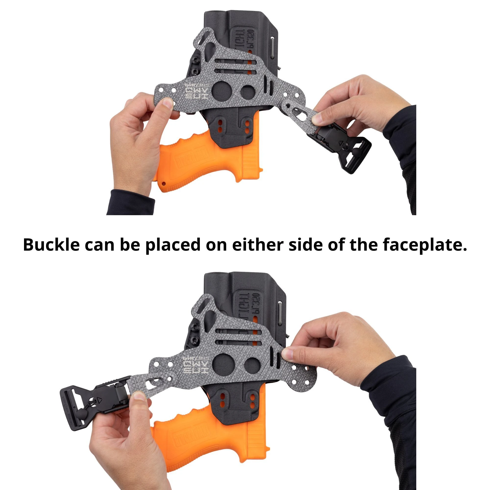 SAFETY WARNING: Make sure your holster is compatible. Do not modify, drill, sand, or cut your Enigma faceplate in ANY way. Do not drill or modify your holster. Thoroughly read the Enigma safety page and holster fit guide before continuing. Failure to fully read and follow ALL of these instructions can result in severe injury or death.