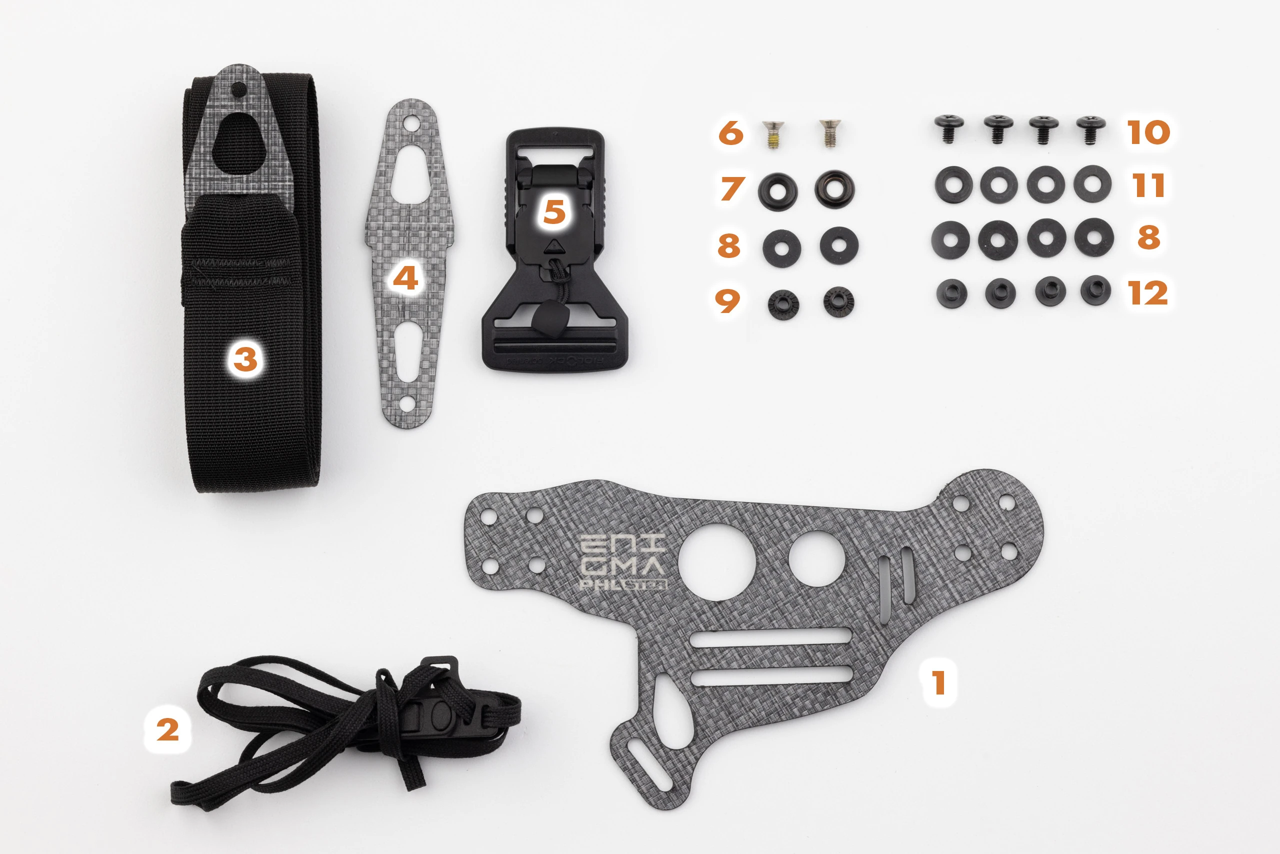 To begin, determine the correct orientation of your holster shell on the Enigma faceplate. For left handed assembly, the logo side of the faceplate will be down. The blank side of the faceplate (1) will be referred to as the FRONT for a left handed assembly (the side WITHOUT the Enigma logo). You may find it helpful to mark this side “FRONT” with masking tape as a reminder.