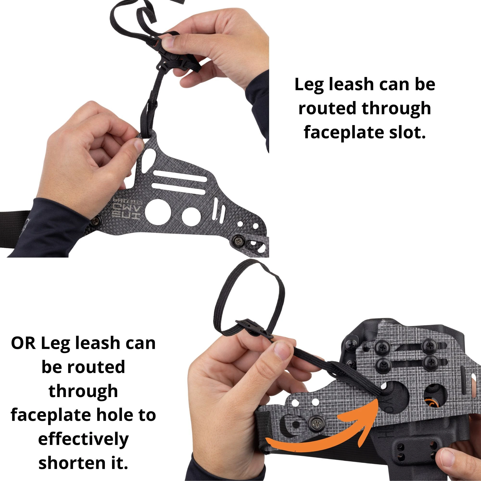 Attach your leg leash (2) to the faceplate. It can go through the leg leash tab at the bottom, or through the larger faceplate hole (if your holster is shorter than the faceplate, see below).